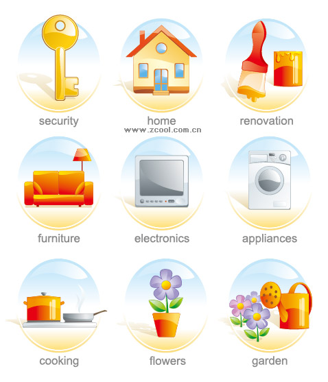 eps format, including jpg preview, keyword: Vector icons, keys, bubbles, house, paint, brushes, sofas, televisions, washing machines, kitchen utensils, cooking, faceplate, flowers, showers, vector material