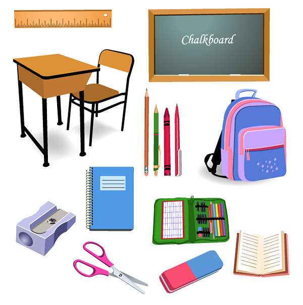 eps format, including jpg preview, keyword: Vector stationery, supplies, rulers, chairs, tables, pencils, ball pens, pencils knife, scissors, notebooks, school bags, blackboard, notebook, vector material
