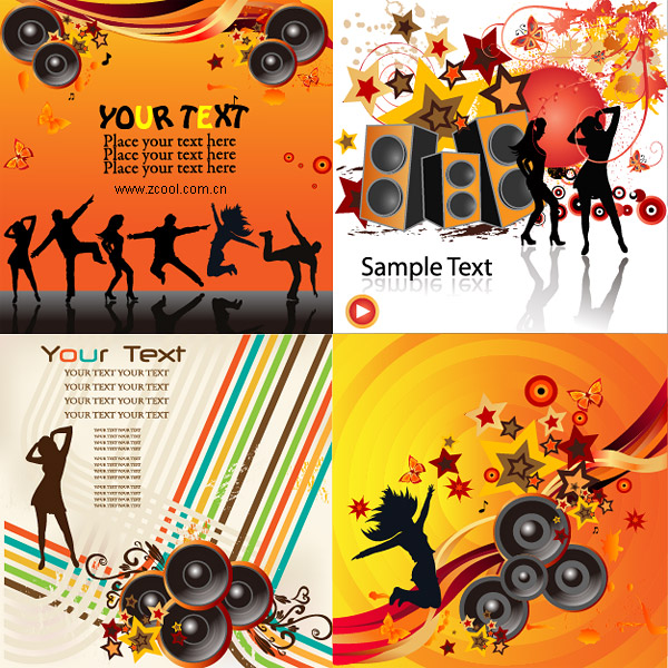 eps format, including jpg preview, keyword: Vector music, party, dance, dancing, jumping, speakers, the trend of design, sound, characters silhouette, female silhouette, male silhouette, dynamic lines, stars, backgrounds, vector material